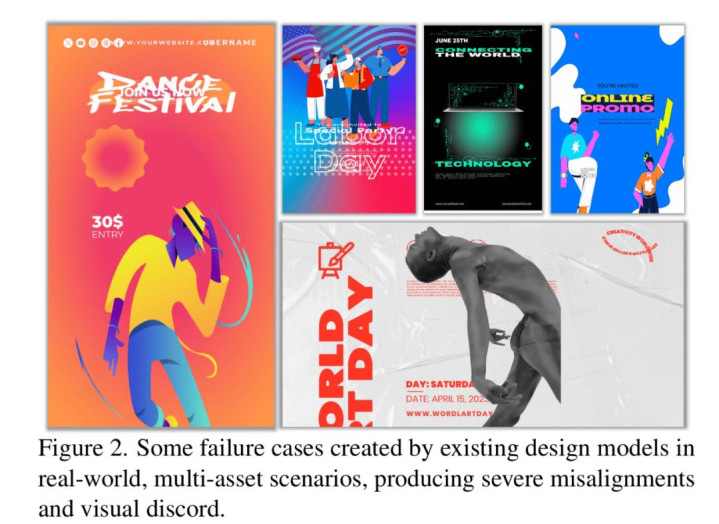 现有模型在处理复杂多素材场景时,常出现严重的元素重叠、文字遮挡以及美学灾难。这反映了现有模型在细粒度布局推理和美学对齐上的根本不足。