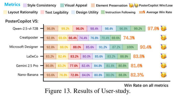 综合胜率: 在人工评测中,PosterCopilot 对比微软 Microsoft Designer、Nano-Banana 以及学术界 SOTA(如 CreatiPoster、LaDeCo),平均胜率超过 74%。