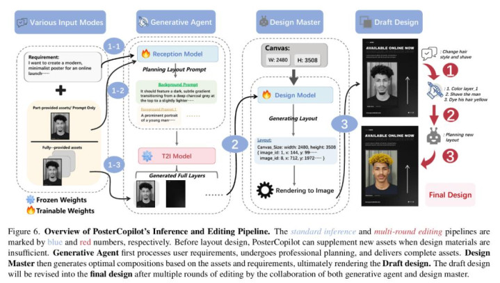 通过将具备精密布局推理能力的设计模型与支持多轮交互的生成式智能体(Generative Agent)深度耦合,团队构建了 PosterCopilot 的完整框架,其从素材规划到最终成稿的推理流水线如下所示: