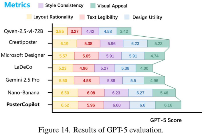 GPT-5 评测: 在 GPT-5 的打分中,PosterCopilot 在布局合理性(Layout Rationality)和风格一致性(Style Consistency)上均大幅领先 Qwen-VL-2.5-72B 和 Gemini 2.5 Pro。